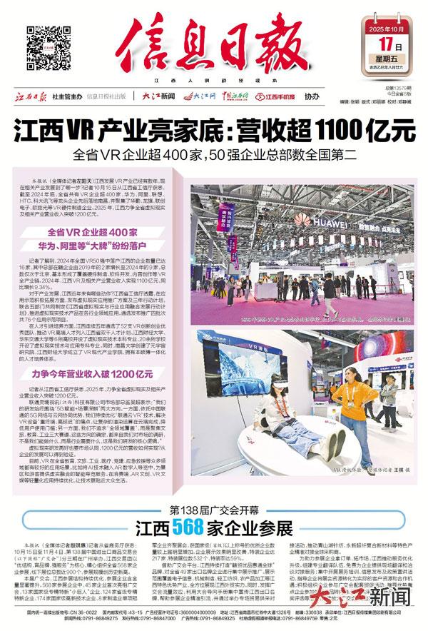 本报讯(全媒体记者左阳天)江西发展VR产业已经有数年,现在相关产业发展到了哪一步?记者10月15日从江西省工信厅获悉,截至2024年底,全省共有VR企业超400家,华为、阿里、联想、HTC、科大讯飞等龙头企业先后落地南昌,并聚集了华勤、龙旗、联创电子、欧菲光等VR硬件制造企业。2025年,江西力争全省虚拟现实及相关产业营业收入突破1200亿元。